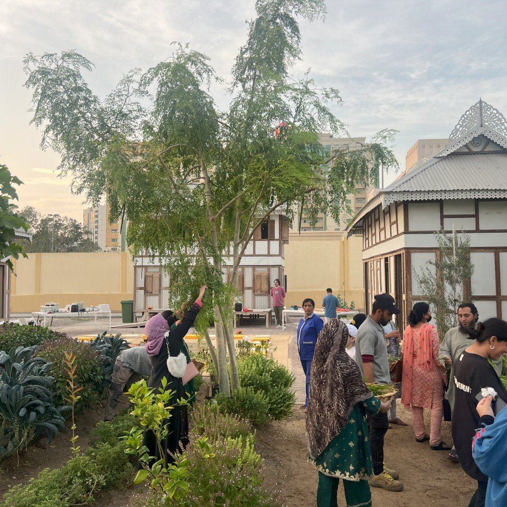 Together with neighbouring communities, the Al Manakh Spaces initiative hosted an evening that combined harvesting, food, and storytelling. Participants explored the urban farm, gathered fresh produce, and came together to share Iftar.