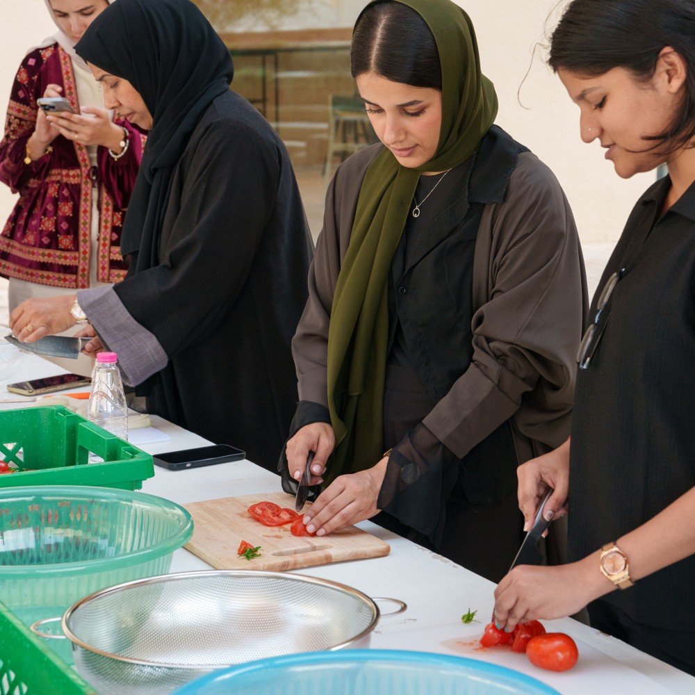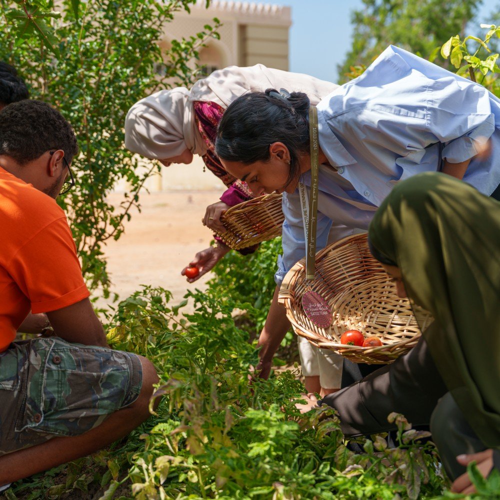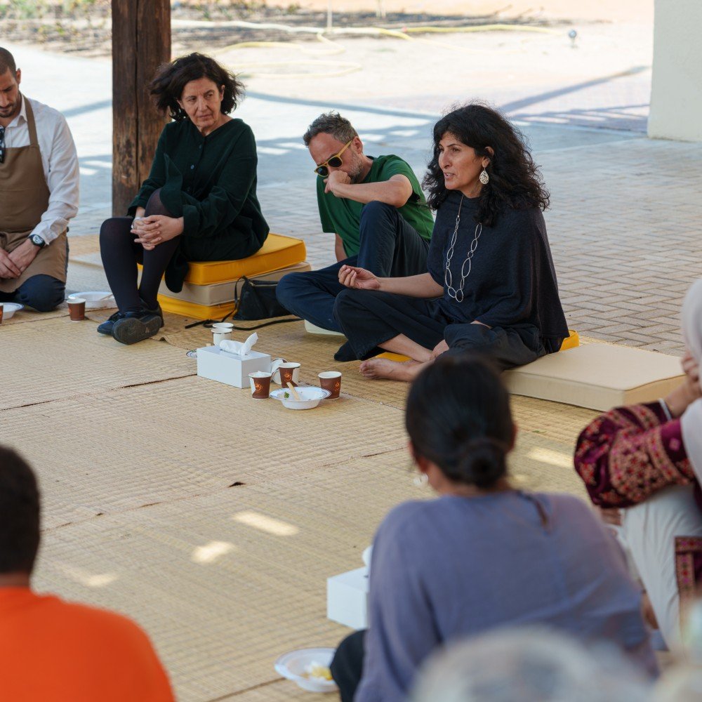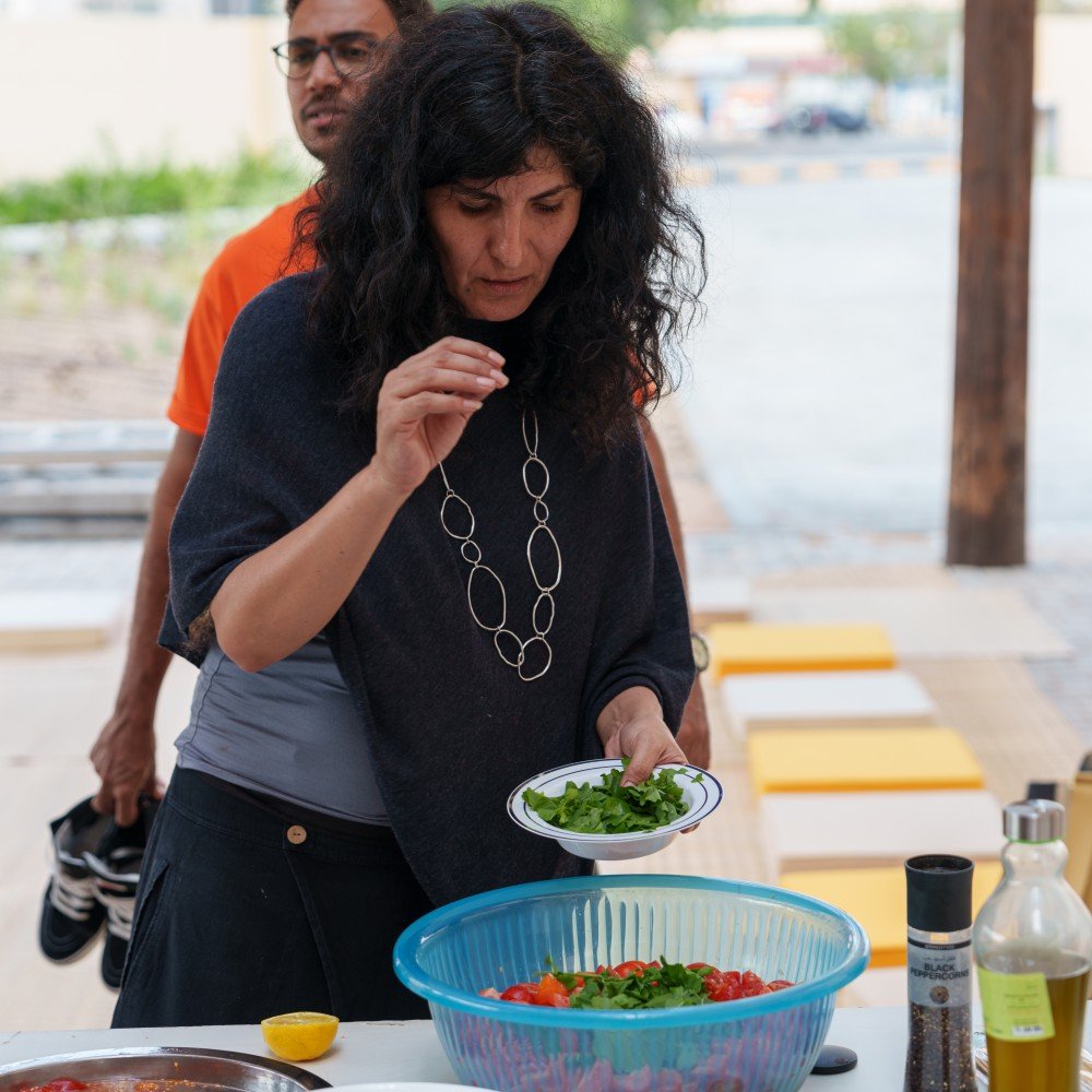 As part of the second edition of the Sharjah Architecture Triennial, Al Manakh Spaces hosted participants Alessandro Petti and Sandi Hilal of DAAR. Building on their “Living Room” initiative, Sandi and Alessandro led a harvesting and cooking session alongside SAT staff, transforming the farm’s produce into a shared meal.
