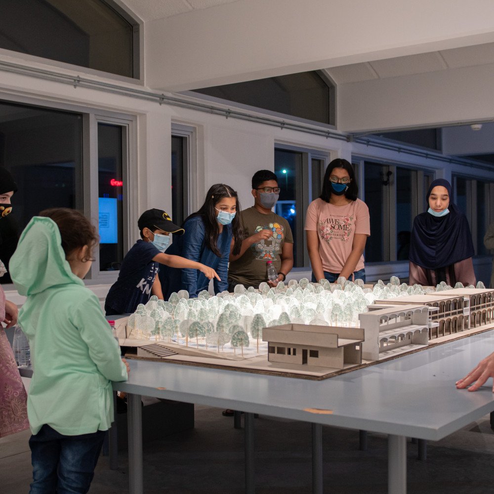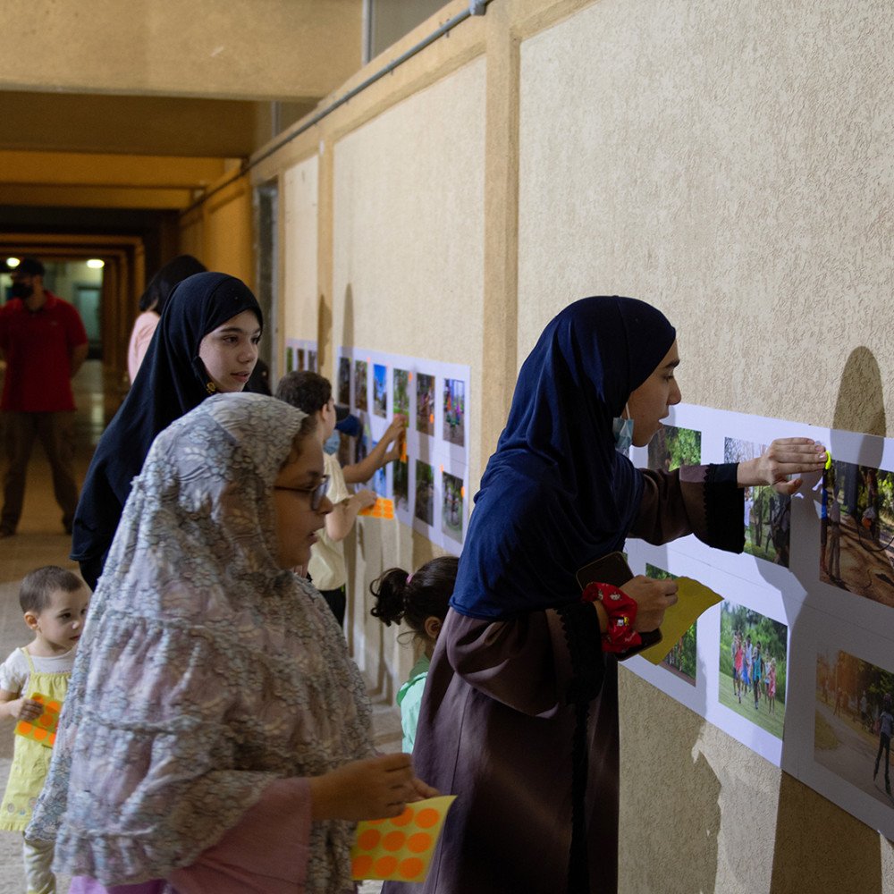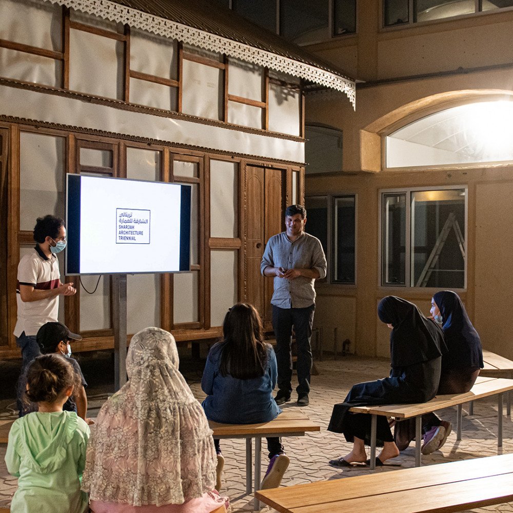 Building on the input received from members of the neighborhood community from the previous co-design workshop, the Triennial invited the participants back to discuss its design proposal for the urban garden. This proposal looked to the design kit collages created previously by community members to help define programmatic functions and preferences. With input in the form of spatial organization, selection and use of locally available flora, the Triennial presented a composite scheme of the community’s requests and ideas along with the institution’s aspirations for the urban garden as a socially and environmentally sustainable public space in the neighbourhood scale. This was communicated through a physical model of the Al Manakh Spaces site along with rendered visuals of the proposal to convey size, scale, density of vegetation and spatial organization to the participants. The physical model acted as a tool to provide scale and context to discuss comments and questions from the community members regarding the proposed scheme; fragments of these conversations were also formally recorded through a survey as a chance for participants to summarize their overall reactions to the proposal.