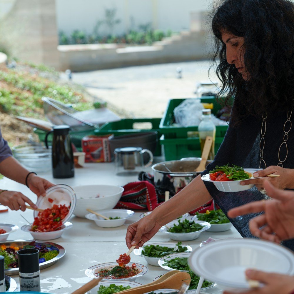 Freshly picked tomatoes, kale, spinach, and cucumbers were prepared together with traditional Palestinian recipes, including Mujadara (rice and lentils) and Daqqa Gazawiya. This act of cooking and eating together created a space that moved beyond formal structures of work, highlighting the farm’s role not only as a site of cultivation but also as one of hospitality, cultural exchange, and collective care.